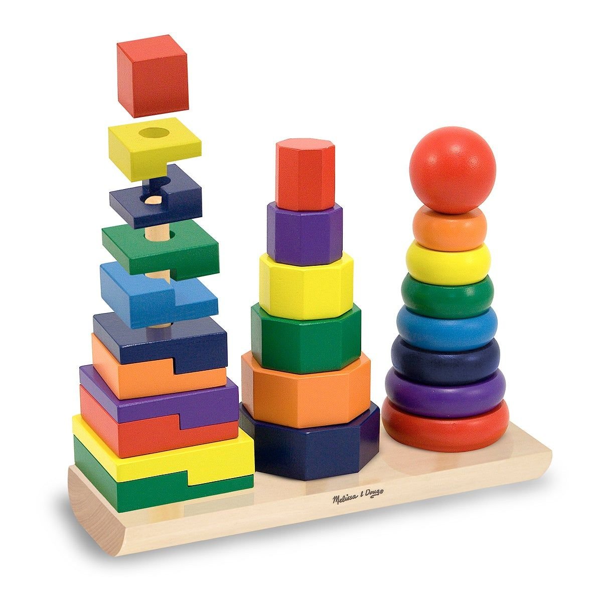 pyramide de formes est composée de plusieurs pièces de formes et de tailles variées, principalement des anneaux, des cubes et des cylindres. Elle permet d’empiler ces pièces les unes sur les autres pour créer diverses structures
